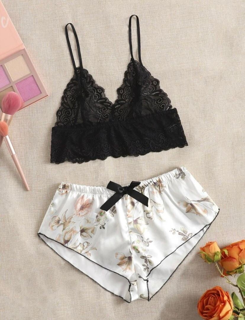JUEGO DE LENCERIA DOS PIEZAS DE ENCAJE NEGRO Y SEDA